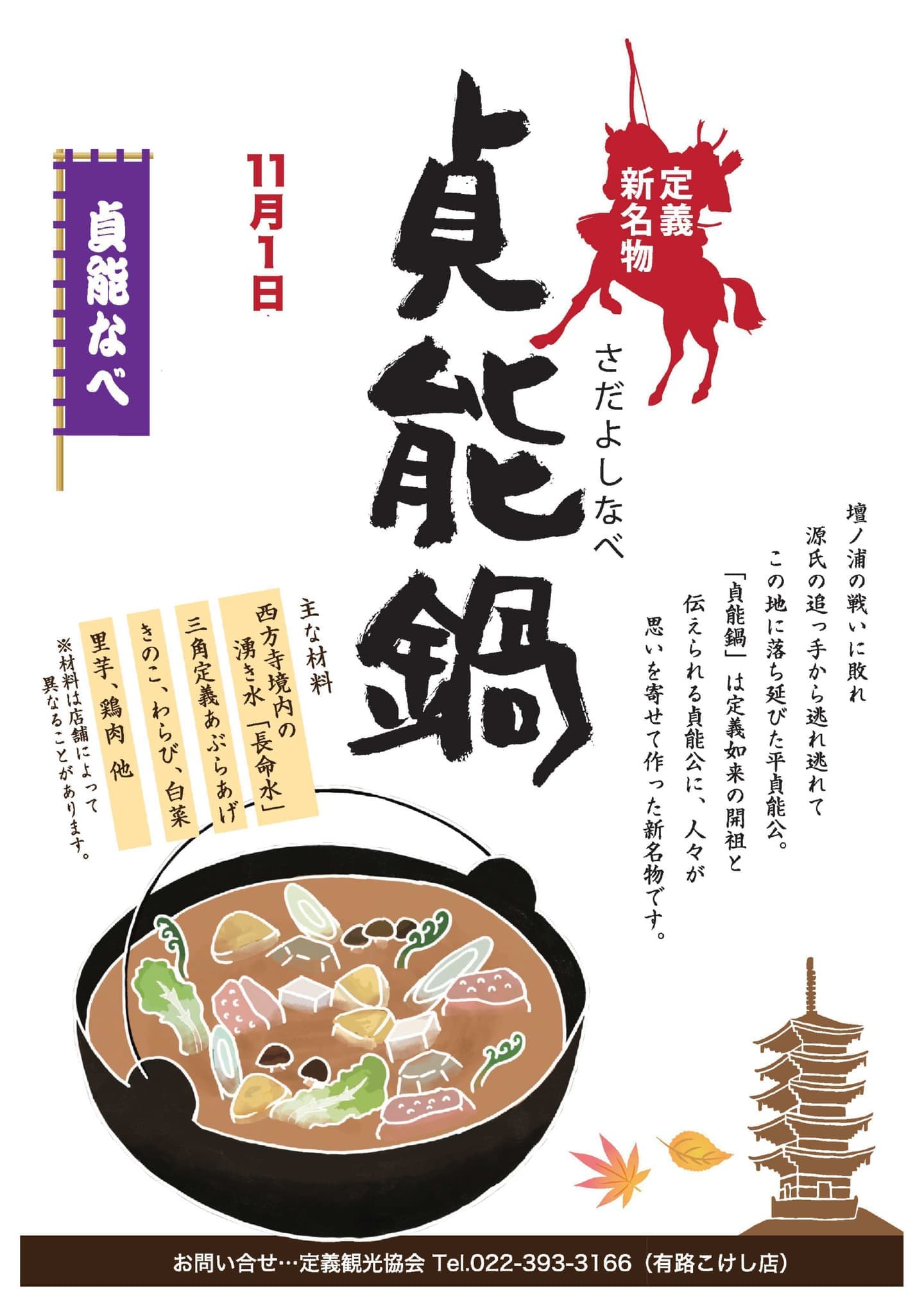 定義の開祖ともいうべき平貞能公にちなみ、昨年より定義門前の店舗で販売している定義「貞能なべ」キャンペーンを開催します。