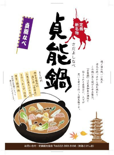 定義の開祖ともいうべき平貞能公にちなみ、昨年より定義門前の店舗で販売している定義「貞能なべ」キャンペーンを開催します。